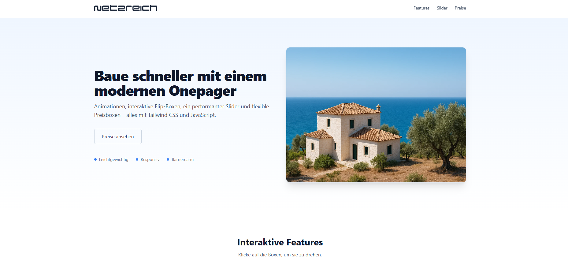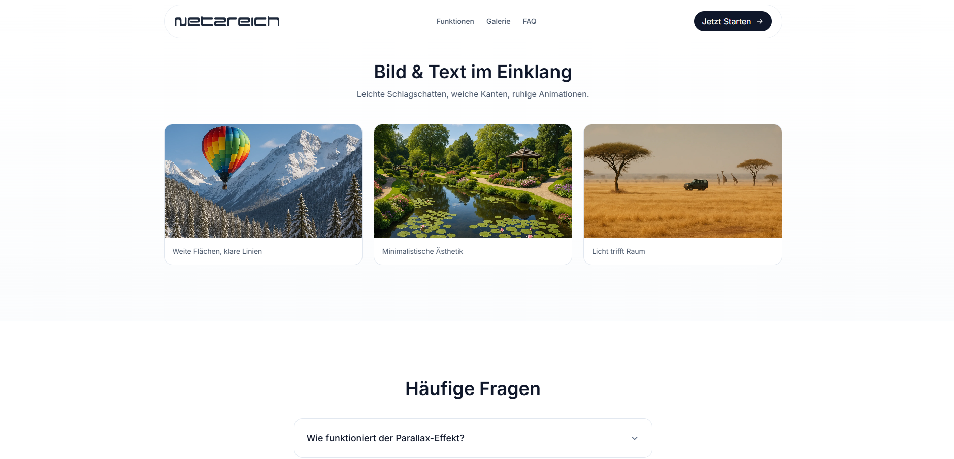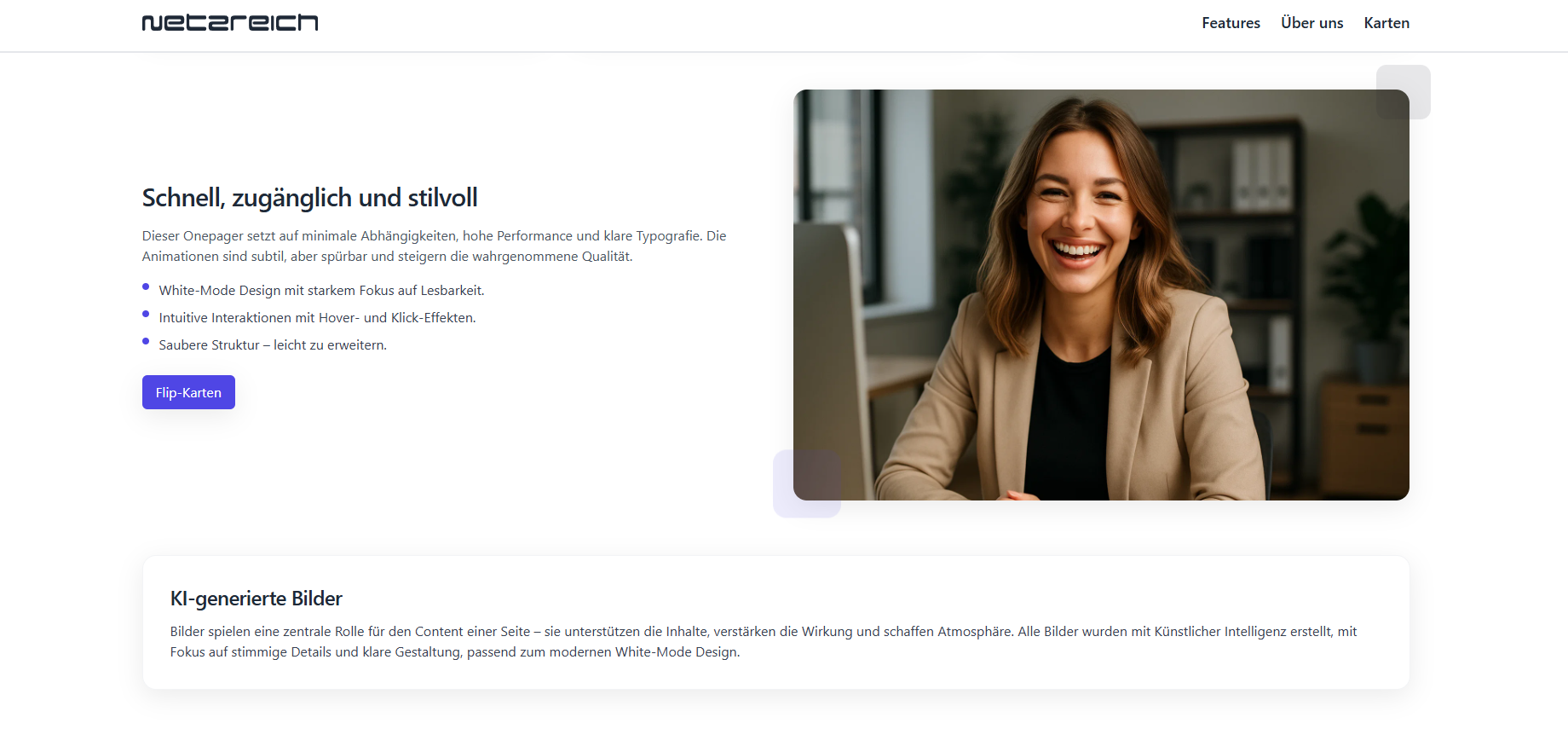 Mit der 279 Euro Website von netzreich erhalten Sie einen modernen, professionellen Onepager zum Festpreis – individuell gestaltet, komplett eingerichtet und startklar für Ihren Online-Auftritt. Einfach, bezahlbar und perfekt für Selbstständige, Unternehmen und Kreative.